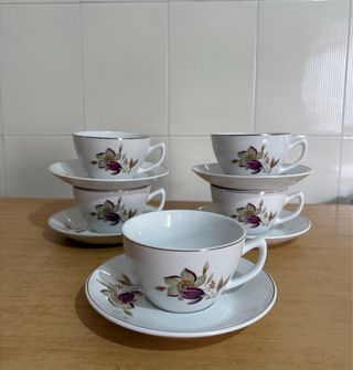 Conjunto de cinco tazas de desayuno antiguas con un diseño floral. - Cada taza tiene un asa. - Incluyen sus respectivos platillos. - Borde dorado en la taza y el platillo. - Diseño de flor en tonos morados y verdes.