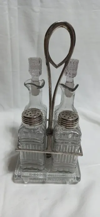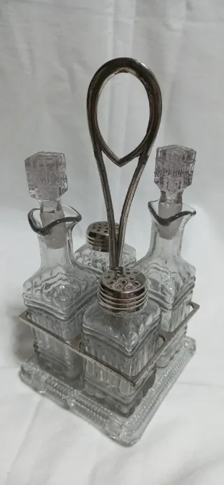 Antiguo juego de mesa para servir aceite, vinagre, sal y pimienta. Incluye cuatro recipientes de cristal con tapas y un soporte metálico. Desgaste típico del tiempo y uso - Cuatro botellas de cristal con diseño labrado. - Dos tapas con perforaciones para salero y pimentero. - Soporte metálico con asa. - Base de cristal.