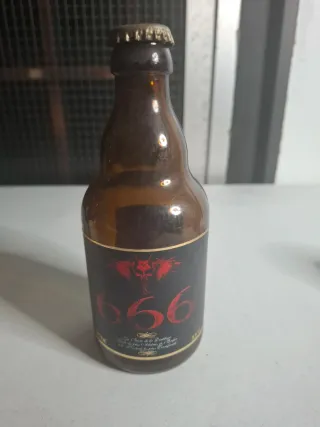 Botella de cerveza vacía de 33cl con etiqueta 666. - Diseño de etiqueta con temática de demonio y el número 666. - Botella de vidrio color ámbar.