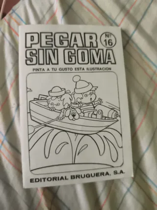 Libro de actividades Pegar sin Goma número 16 de Editorial Bruguera. - Ilustración para colorear y pegar. - Incluye la portada con el título Pegar sin Goma y el número 16. - La parte inferior muestra EDITORIAL Bruguera, S.A.