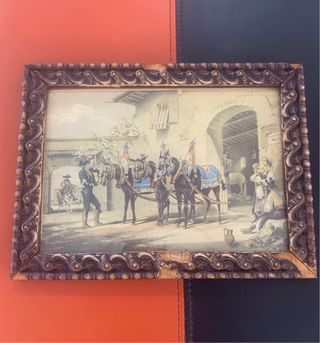 Cuadro antiguo con temática taurina, enmarcado en madera. - Representación de figuras vestidas de época. - Marco de madera con acabado rústico. Ha pertenecido a un local de hostelería taurino que ha estado abierto desde 1870 hasta 2024. Ahora sigue abierto con una decoración moderna. Durante más de 100 años ha acumulado recuerdos taurinos, fotografías, carteles, firmas.... Medidas Alto 21,5cm Ancho 18cm