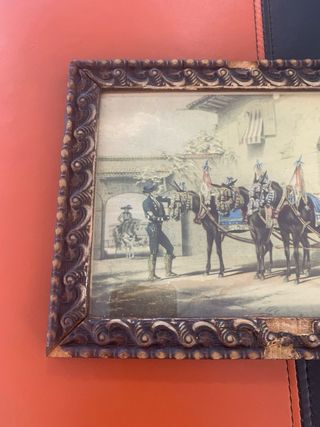 Precioso cuadro decorativo con escena taurina. - Representación de Cuadra y Plaza. - Marco de madera tallada. Ha pertenecido a un local de hostelería taurino que ha estado abierto desde 1870 hasta 2024. Ahora sigue abierto con una decoración moderna. Durante más de 100 años ha acumulado recuerdos taurinos, fotografías, carteles, firmas... Medidas Alto 18cm Ancho 23,5cm