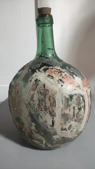Damajuana de vidrio, muy antiguas, en color verde, con un tapón de corcho, mide unos 43 cm de alta. La superficie está decorada con pintura de diferentes texturas y colores, pero se podría quitar con decapante. Por eso la he puesto un poco más barata