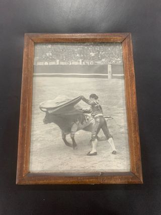 Reproducción de fotografía taurina enmarcada. - Imagen de un torero y un toro en la arena. - Marco de madera. Ha pertenecido a un local de hostelería taurino que ha estado abierto desde 1870 hasta 2024. Ahora sigue abierto con una decoración moderna. Durante más de 100 años ha acumulado recuerdos taurinos, fotografías, carteles, firmas... -Medidas Alto 31,5cm Ancho 24cm
