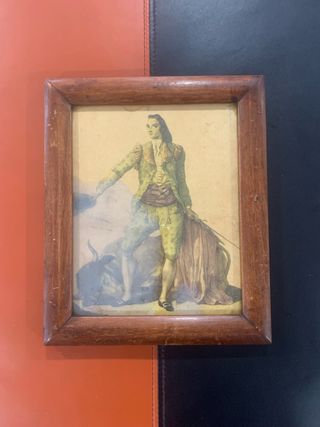 Detalle de una escena taurina enmarcada. La obra presenta un torero con vestimenta tradicional y un toro. - Marco de madera. - Ilustración de temática taurina. Ha pertenecido a un local de hostelería taurino que ha estado abierto desde 1870 hasta 2024. Ahora sigue abierto con una decoración moderna. Durante más de 100 años ha acumulado recuerdos taurinos, fotografías, carteles, firmas.... -Medidas Alto 25cm Ancho 21cm