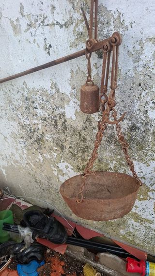 Balanza romana antigua fabricada en hierro fundido. Un objeto con carácter y un diseño clásico. - Material: Hierro fundido. - Estilo: Balanza romana tradicional. - Componentes: Incluye pesa y cuenco para pesar.