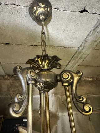 Elegante lámpara de bronce con un diseño clásico y detalles ornamentales. - Acabado en bronce. - Diseño con múltiples brazos y tulipas. - Detalles grabados en las tulipas y la base. - Lampara en muy buen estado ha sido muy cuidada pero por mudanzas esta en desuso, se puede limpiar antes de la venta.