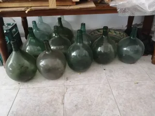 Conjunto de 12 damajuanas antiguas de vidrio, perfectas para decoración o coleccionismo. Precio unidad 45€. - Material: Vidrio. - Color: Verde y transparente , 2 son de vidrio blanco se ven en la foto.
