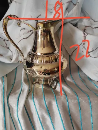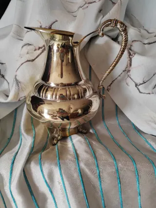 Elegante jarra antigua de alpaca con un diseño clásico y detallado. Las medidas están en una de las fotos. - Material: Alpaca. - Patas decorativas. - Asa ornamentada.