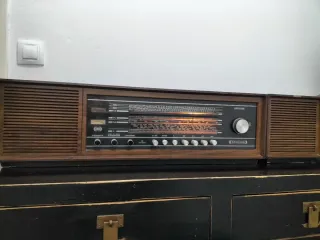 Radio vintage de la marca Grundig, con un diseño clásico y elegante. Funciona. Es grande, mide 87 de largo, 23 de ancho y 20 de alto - Acabado en madera. - Un altavoz integrado, el otro va separado - Diales de sintonización de sintonización.