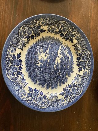 Conjunto de doce platos de porcelana inglesa con un diseño clásico. - Diseño floral y paisajístico en azul. - Porcelana de alta calidad. 6 de postre, tres llanos3 ondos. 6 en buen estado los ottos 6 de regalo.