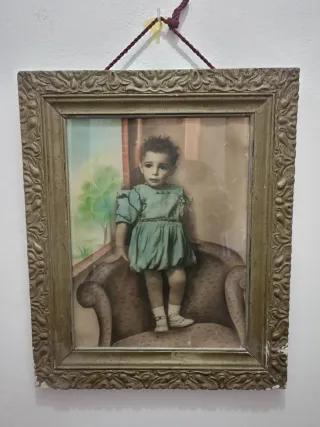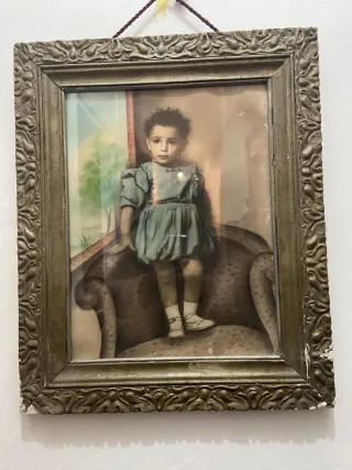 Fotografía antigua enmarcada en un marco con detalles ornamentados. La imagen muestra a una niña sentada en un sillón. - Marco con diseño clásico. - Fotografía con tonos sepia y detalles de color.