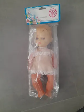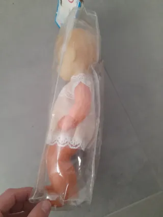 Muñeca bebé antigua, conservada en su embalaje original. De trastienda. - Muñeca de plástico. - Vestido de época. - Presentada en blister.