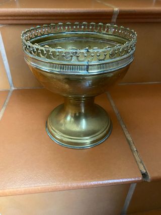 Elegante frutero de latón con un diseño clásico y un acabado brillante. Su base con pedestal le da un toque distintivo. - Material: Latón - Borde superior con detalle calado y greca - Base tipo pedestal