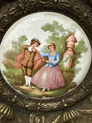 Precioso plato decorativo antiguo con un marco de latón ornamentado. Presenta escenas románticas pintadas a mano en el centro y en varios medallones. - Marco de latón con detalles. - Medallones con escenas pintadas. - Diseño vintage.