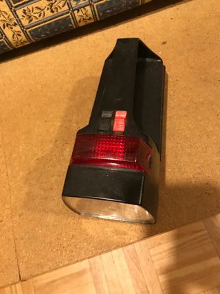 Linterna de mano de color negro con asa. - Lente frontal transparente. - Detalle de luz roja en la parte trasera. - Interruptor de encendido/apagado.