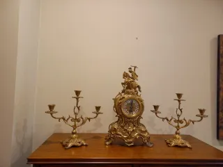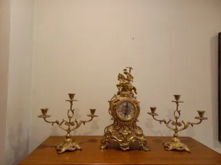 Conjunto de dos candelabros antiguos y un reloj de sobremesa. - Candelabros con diseño floral. - Reloj con figura ecuestre.