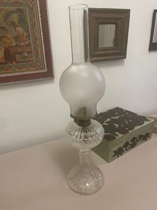 Preciosa lámpara de aceite antigua de cristal tallado. Un objeto decorativo con encanto. 47 cm de altura. perfecto estado de vonservacion. Totalmente funcional. - Cuerpo de cristal transparente. - Detalle de tallado en la base y el depósito. - Quemador de latón.