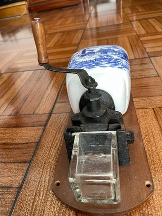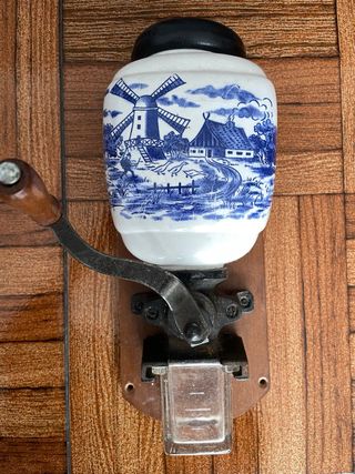 Molinillo de café vintage con un diseño decorativo de molino y paisaje holandés. - Cuerpo de cerámica con pintura azul. - Mecanismo de molienda de metal. - Manivela de madera. - Cajón recolector de cristal.
