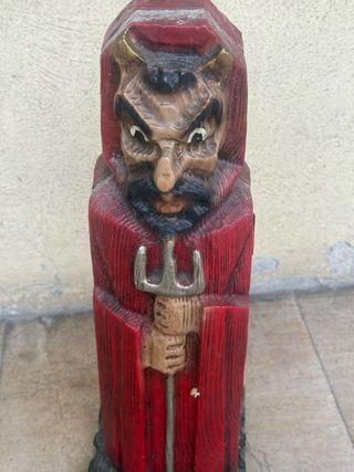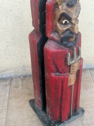 Original botellero con forma de diablo sosteniendo un tridente. Una pieza decorativa y funcional. - Diseño detallado del diablo. - Acabado en color rojo y detalles en dorado.
