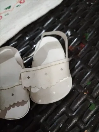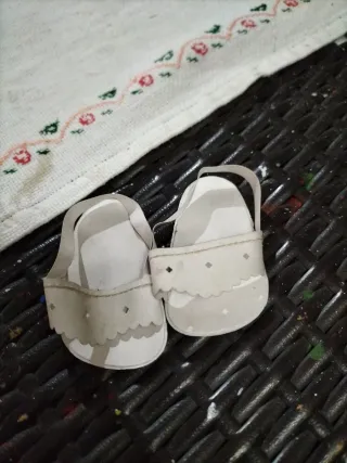 Preciosos zapatos antiguos para muñeca, ideales para coleccionistas. - Diseño delicado con borde festoneado. - Tiras finas y detalle de pequeños rombos.Miden 7,5 CNT .