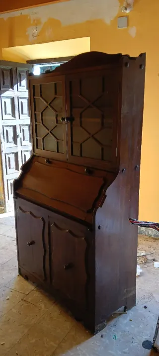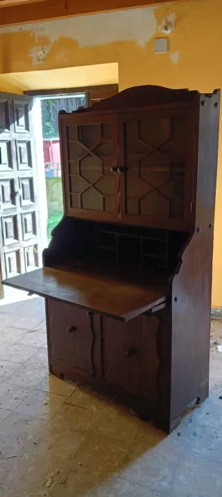 Buró de estilo clásico, ideal para proyectos de restauración. Su diseño evoca la época de los años 70. - Mueble de madera oscura. - Puertas acristaladas con diseño. - Cajones y compartimentos interiores.