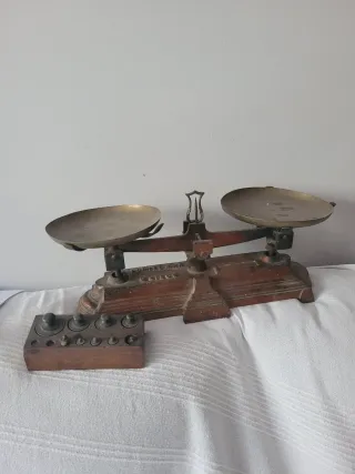 Balanza de hierro antigua franceA, ideal para coleccionistas o decoración. - Fabricada en hierro fundido. - Incluye juego de pesas de metal.
