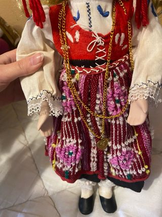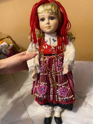 Preciosa muñeca de porcelana con un traje tradicional. - Vestido rojo y blanco con detalles bordados. - Adornos dorados y collar. - Cabello rubio y ojos azules.
