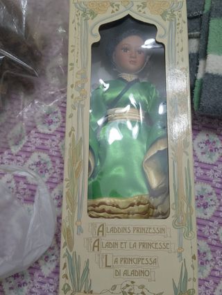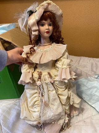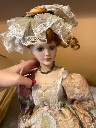 Preciosa muñeca de porcelana con un vestido de época. - Detalles en encaje y perlas. - Sombrero adornado con plumas. - Cabello rizado y ojos verdes.