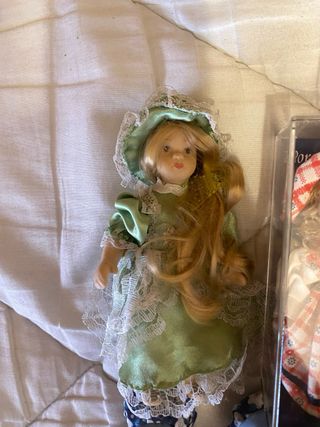 Conjunto de varias muñecas de porcelana con detalles delicados. - Muñeca en caja azul con vestido blanco. - Muñeca con vestido verde y sombrero. - Muñeca en caja a cuadros. - Dos muñecas vestidas de rojo y negro. - Muñeca con vestido floral y otra pequeña.