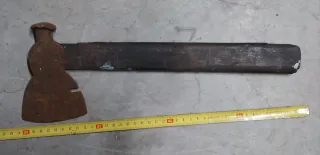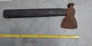 Hacha antigua con mango de madera y cabeza de metal oxidado. - Mango de madera. - Cabeza de metal.