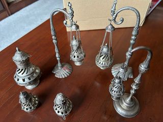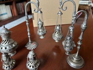Conjunto de seis botafumeiros, 1 de plata, y los otros de metal plateado. Réplica del existente en la Catedral de Santiago de Compostela. - Diseño intrincado y detallado. - peso: 298 gr - Incluye seis piezas.