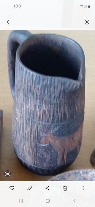 Jarra antigua de madera con un diseño rústico y un grabado de un animal.