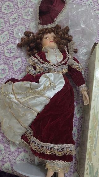 Preciosa muñeca de porcelana con un vestido detallado y sombrero. - Vestido de época en tonos burdeos y crema. - Encaje y adornos de perlas. - Sombrero a juego con lazo y plumas. - Expresión facial delicada.