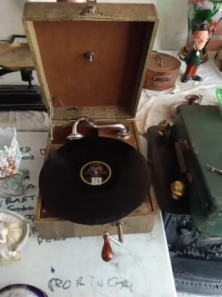 Gramófono portátil de estilo maletín, con disco Pathé. - Diseño clásico en formato maletín. - Incluye plato y brazo fonocaptor. - Manivela para dar cuerda.