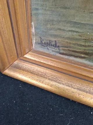 Conjunto de dos cuadros antiguos, uno con una escena marina y otro con una bicicleta. - Cuadro de barco de vela en el mar. - Cuadro de una persona con una bicicleta antigua.