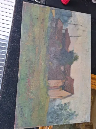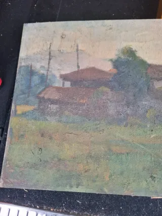 Óleo sobre lienzo de un paisaje urbano, con edificios y vegetación. La obra está firmada. - Pintura de Laredo. - Artista: Pintor asturiano. Preguntar precio
