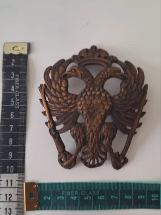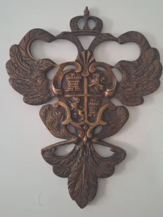 Aplique antiguo calado de metal pesado, con representación de águila con alas desplegadas y escudo cuartelado coronado. Pieza maciza, de gran peso (487 gramos, ver fotografía), con relieves bien definidos y pátina antigua original. El anverso y el reverso son iguales, como corresponde a este tipo de aplique fundido. Presenta desgaste y oscurecimiento propios del paso del tiempo, sin roturas ni restauraciones. Fundición de buena calidad, compatible por peso, densidad y pátina con bronce u otra aleación antigua similar. Probable fabricación de finales del siglo XIX o comienzos del siglo XX.