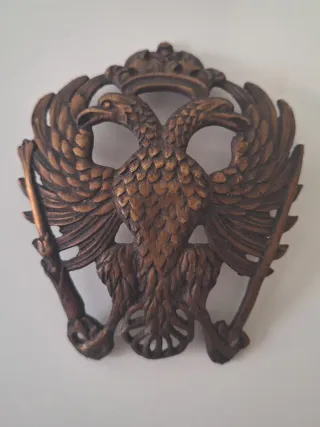 Aplique antiguo calado de latón, con representación de águila coronada con yugo y flechas. Pieza original de época, con pátina antigua y buen relieve. Peso aproximado: 82 g (ver fotografía). Anverso y reverso iguales, propio de fundición antigua. Probable fabricación de los años 40 (primer franquismo). Ideal para decoración histórica, coleccionismo o restauración de mueble antiguo. Se vende tal como se muestra en las fotografías.