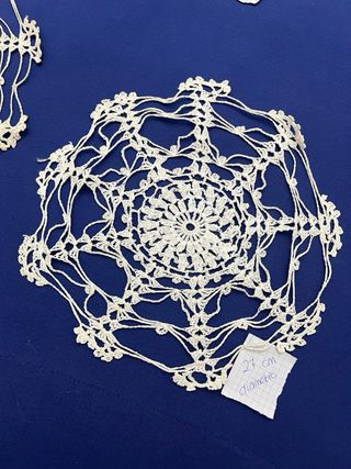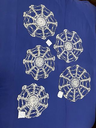 Conjunto de cinco tapetes de ganchillo hechos a mano, con un diseño intrincado y delicado. - Estilo vintage de los años 20. - Color blanco roto. - Perfectos para decoración o coleccionismo.