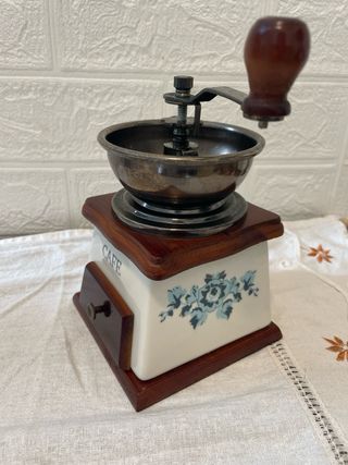 Molino de carne manual de estilo vintage, ideal para preparar tus propias carnes picadas o embutidos. - Fabricado en metal plateado. - Incluye manivela de madera. - Diseño clásico y funcional.