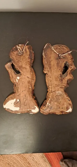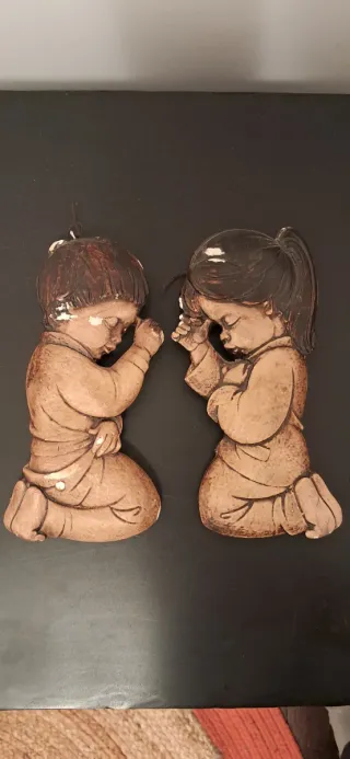 Pareja de figuras antiguas decorativas de dos niños rezando. Tienen un acabado rústico y ganchos en la parte posterior para poder colgarlos en la pared. Evidentes signos de uso (ver fotos).
