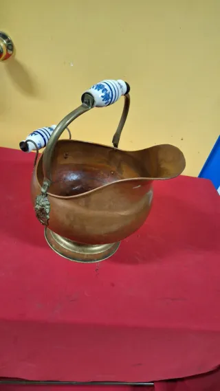 Elegante carbonera antigua de cobre con detalles decorativos. - Material principal: Cobre. - Base y asa de metal. - Asas decoradas con motivos florales azules y blancos. Alto : 37 ancho : 36 Teléfono: 636 20 48 47