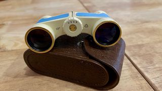 Binocular vintage de la URSS, ideal para ópera o coleccionismo. Incluye su funda de cuero. - Aumento 2,5x. - Diseño clásico en blanco y azul. - Funda de cuero marrón con relieve.