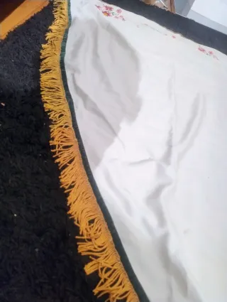 Manto de salida de la Hermandad de la Macarena. Precioso diseño con detalles bordados. - Manto blanco con borde de flecos dorados. - Bordado floral en la parte superior. - Escudo central bordado.