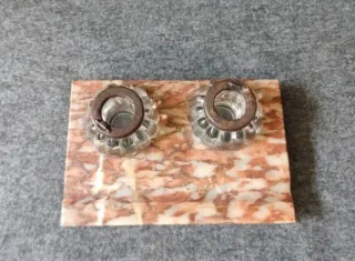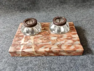 Antigua escribanía de mármol con tinteros de cristal, años 20. Los tinteros tienen el borde metálico y les falta la tapa. Ver fotos para dimensiones y estado. Precioso para pisapapeles