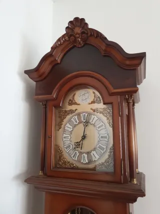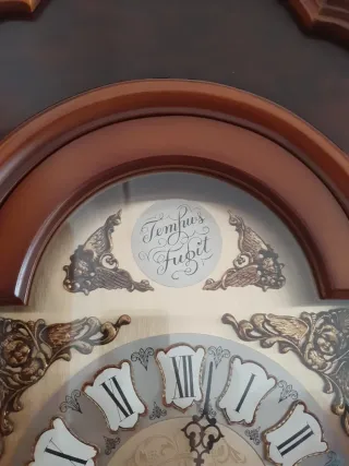 Elegante reloj de pie antiguo de madera con la inscripción Tempus Fugit. - Reloj de carrion. - Antiguedad. - Diseño clásico y atemporal. - Caja de madera oscura. - Esfera con números romanos. En perfecto estado de conservación. No se envía. Recoger en Pamplona.