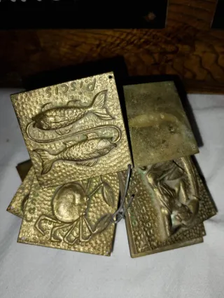 Conjunto de placas metálicas con grabados del zodiaco. Probablemente bronce - Diseño antiguo. - Cada placa representa un signo zodiacal con su símbolo. - Unidas por un alambre.