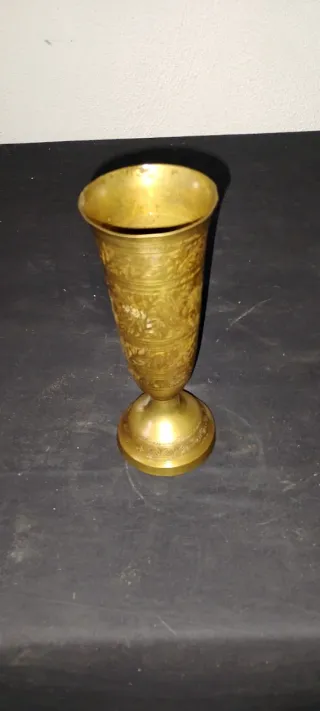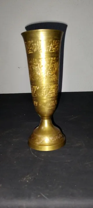 Vaso o copa antigua de bronce con un diseño grabado. 16 cm de altura - Material: Bronce. - Decoración: Grabados de escenas naturales con plantas y animales. - Base: Pequeña base circular.