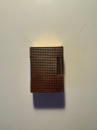 Elegante mechero Dupont con acabado dorado y diseño texturizado. - Cuerpo metálico con patrón de rombos. - Detalle de líneas verticales en un lateral.